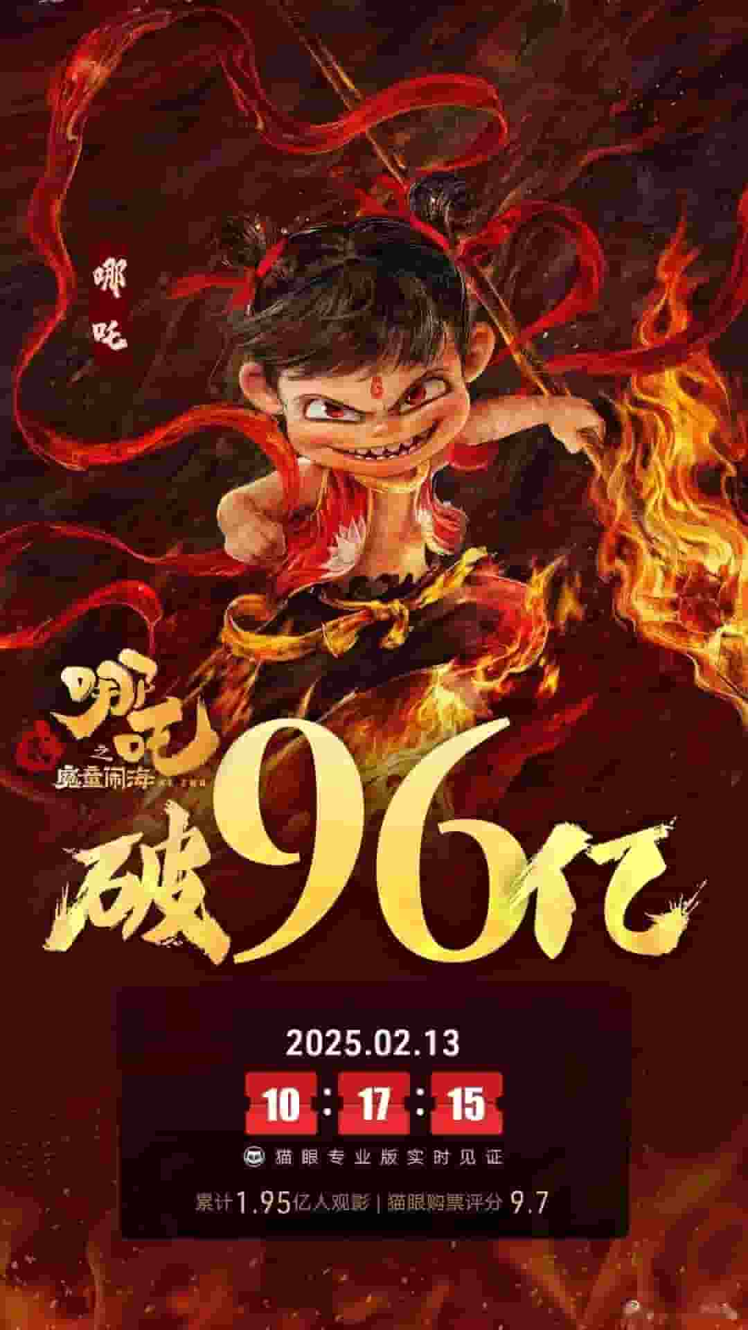据猫眼专业版数据显示,自上映以来,《哪吒之魔童闹海》在国内市场表现出色。仅仅上映16天,其总票房就已经突破了96亿元大关,距离100亿元的里程碑仅一步之遥。这一成绩不仅彰显了影片的过硬品质,也体现了观众对其的高度认可。