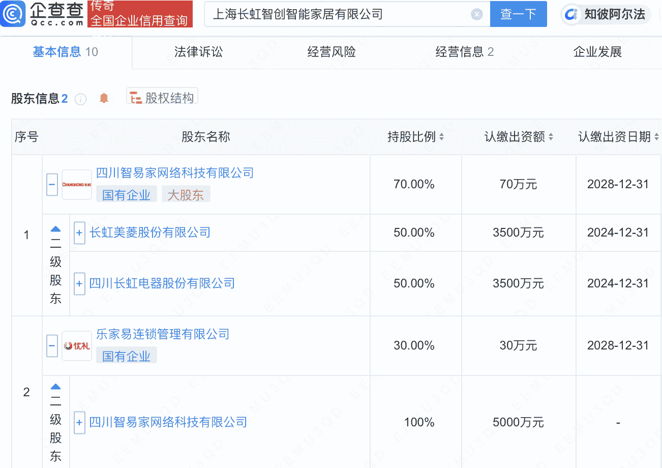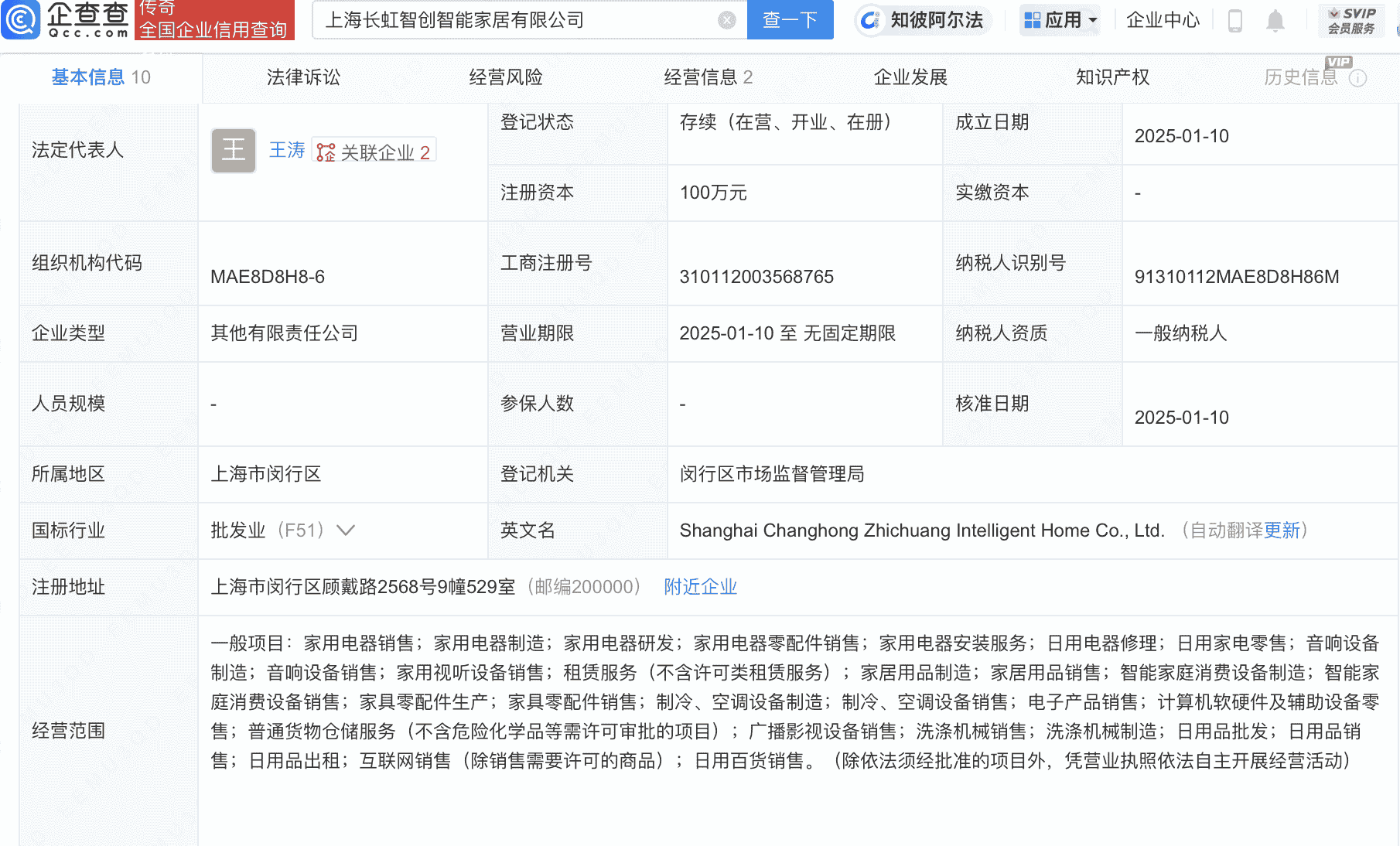 企查查APP显示,近日,上海长虹智创智能家居有限公司成立,法定代表人为王涛,注册资本100万元,经营范围包含:家居用品销售;智能家庭消费设备制造;智能家庭消费设备销售;家具零配件生产等。企查查股权穿透显示,该公司由长虹美菱(000521)、四川长虹(600839)合资公司四川智易家网络科技有限公司间接全资持股。