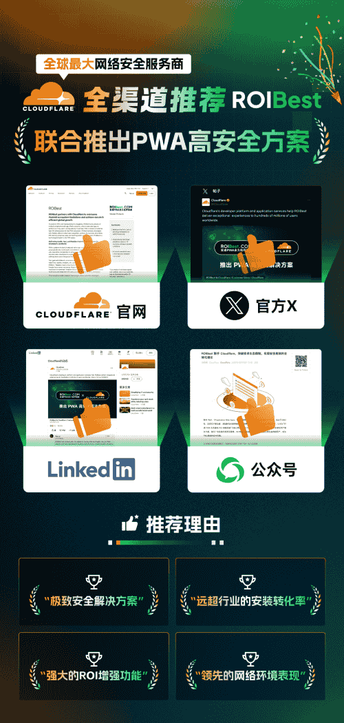 Cloudflare全渠道的权威推荐,再次印证了ROIBest在全球流量营销领域以及PWA解决方案的领先地位。