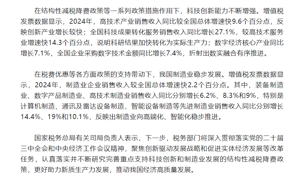国家税务总局的相关负责人表示,税务部门将继续深入贯彻党的二十届三中全会和中央经济工作会议的精神,紧密围绕创新驱动发展战略和促进实体经济发展的改革任务,认真执行并不断研究完善针对科技创新和制造业发展的结构性减税降费政策。这一系列的举措旨在更好地推动新兴生产力的发展,为我国的经济高质量发展注入强劲的动力。