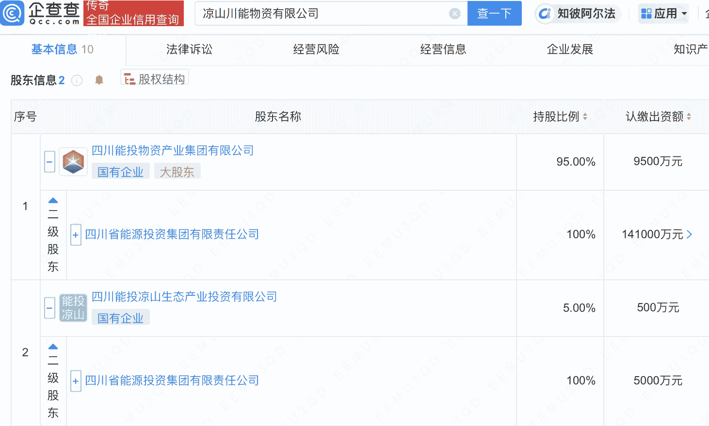 企查查APP显示,近日,凉山川能物资有限公司成立,法定代表人为宁建民,注册资本1亿人民币,经营范围包括供应链管理服务、物业管理、机械设备租赁、普通货物仓储服务等。企查查股权穿透显示,该公司由四川省能源投资集团有限责任公司间接全资持股。