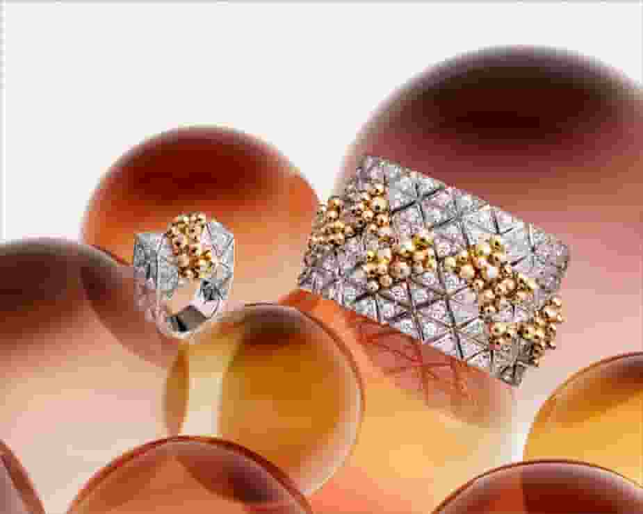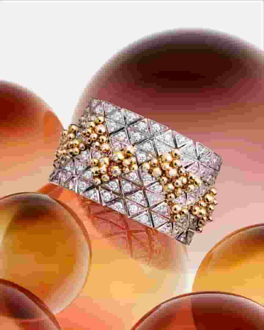 在珠宝的设计上,TUTTITUTTI系列巧妙地融合了有序的几何结构与灵动的自然之美。璀璨的珠宝上,规律的几何图案被自然形态的金珠所打破,形成了一种有序与无序之间的平衡美。这种截然不同的设计元素相互辉映,共同构成了这一系列作品的独特魅力。