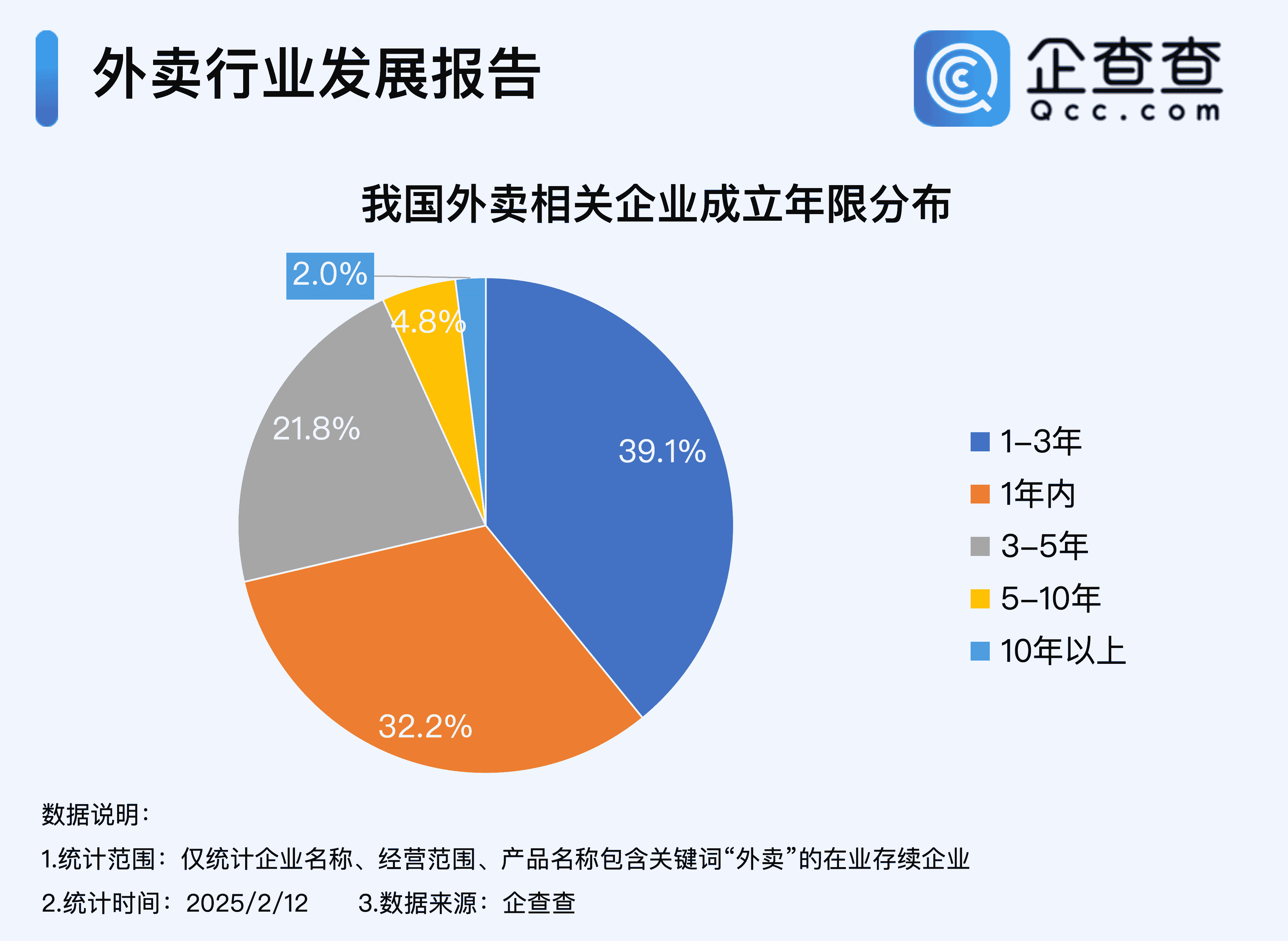 企查查数据显示,我国现存310万家外卖相关企业。成立年限上,我国超七成外卖相关企业在3年内成立,其中成立年限在1-3年之间的企业最多,占比39.1%,成立1年内的企业占比32.2%。