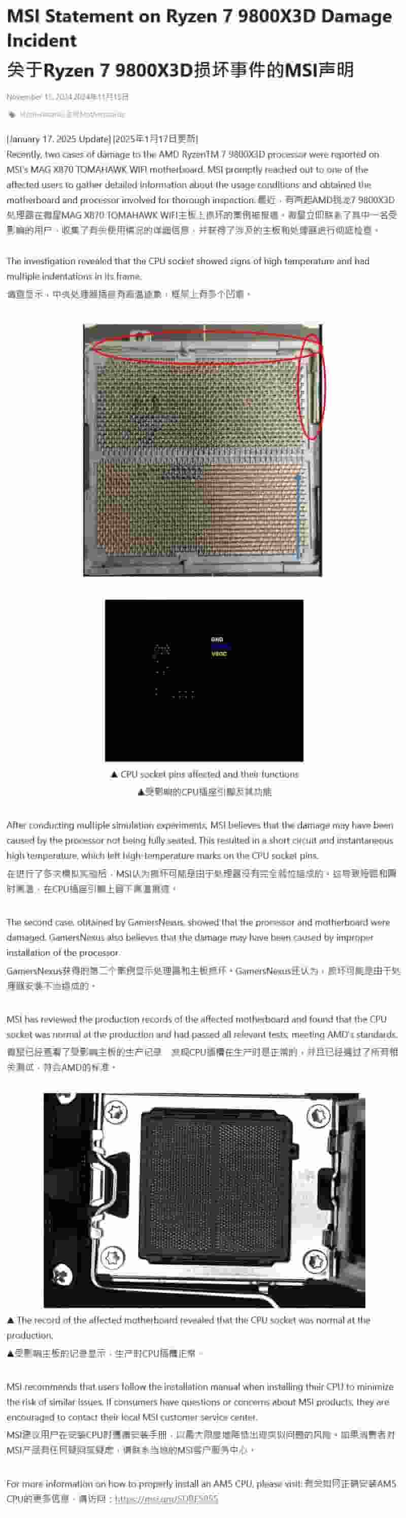 据TECHPOWERUP报道,类似情况此前已在微星主板上出现。微星在对此类事件进行调查后,于1月17日发布声明称,故障原因是处理器未能完全安装到位。