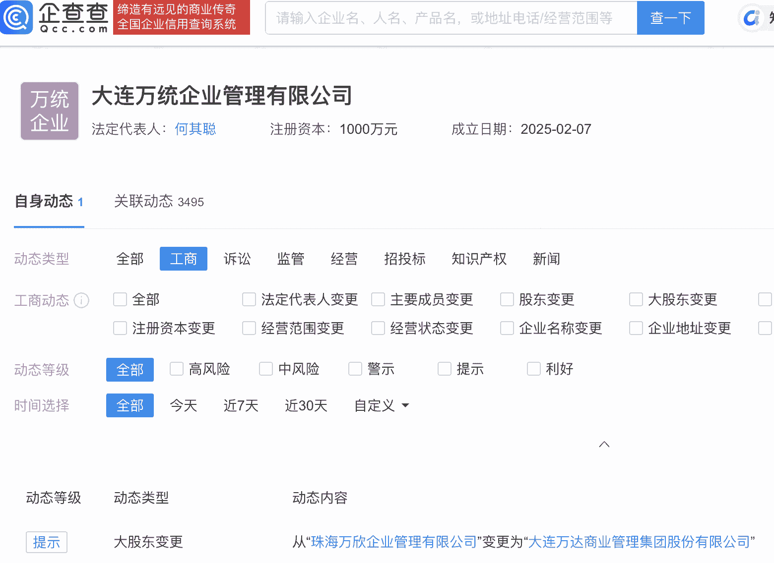 企查查APP显示,2月7日,大连万统企业管理有限公司成立,法定代表人为何其聪,注册资本1000万人民币,经营范围为企业总部管理、企业管理咨询、以自有资金从事投资活动。企查查信息显示,2月11日,该公司全资股东由珠海万欣企业管理有限公司变更为大连万达商业管理集团股份有限公司,前者由大连万达商业管理集团股份有限公司全资持股。