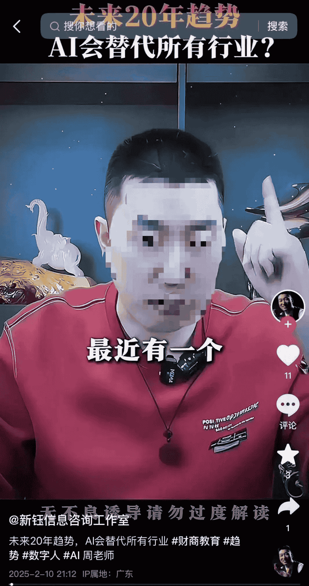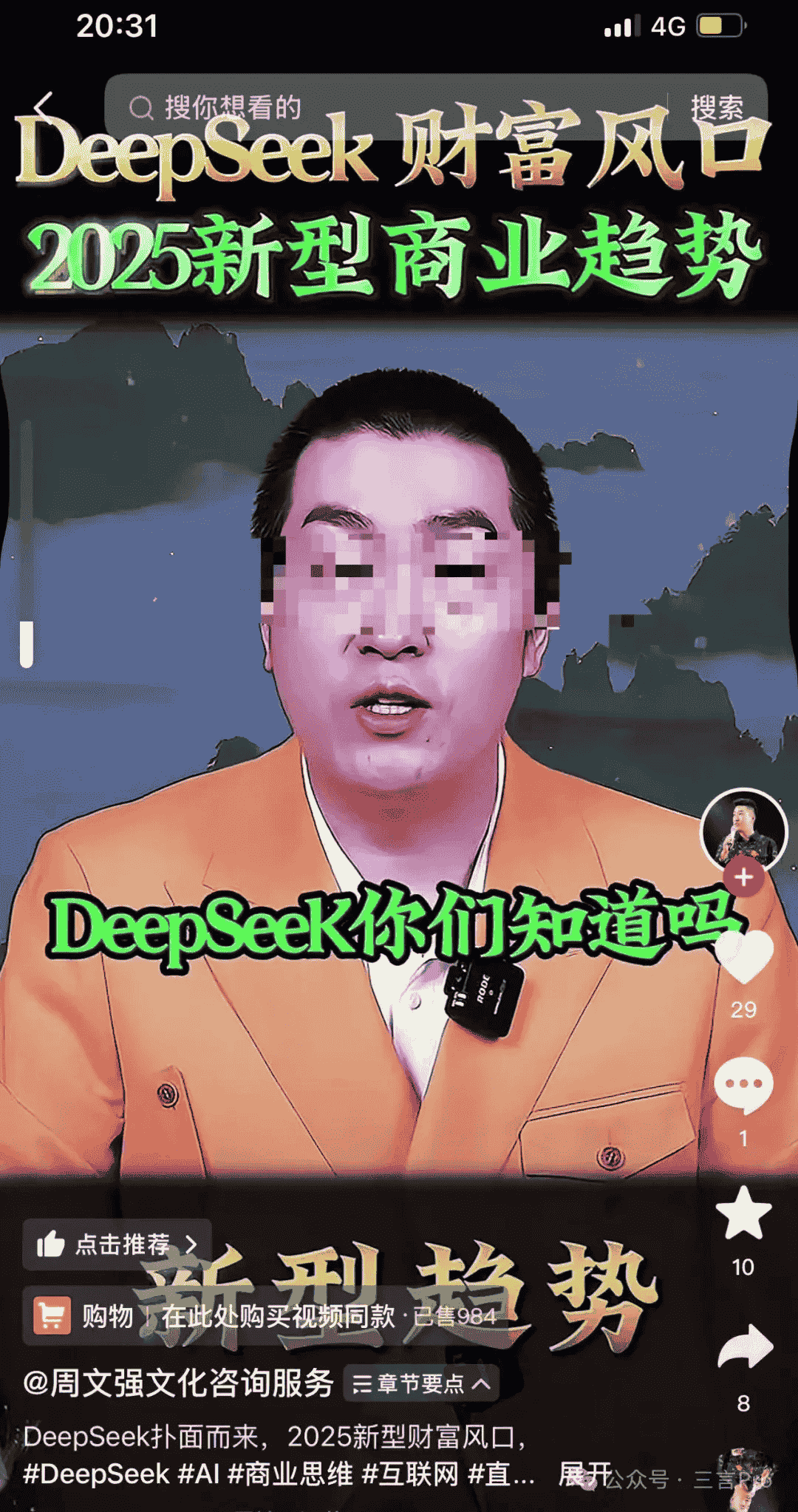 一些在其他领域取得成功的博主和培训机构也开始涉足DeepSeek课程销售。例如,以讲述秦始皇和大秦帝国而在短视频平台走红的周文强,也开始讲起了DeepSeek。尽管其视频中的声音听起来有些不自然,疑似使用了数字人技术,但这并未阻止他借DeepSeek热点进行课程推广。