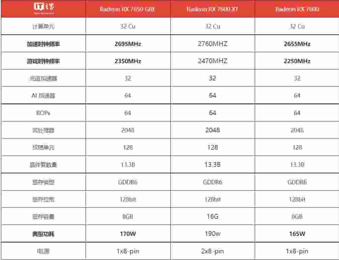 为了更全面地了解RX 7650 GRE显卡的性能,我们对比了AMD官网上的详细参数,以及RX 7600XT和RX 7600显卡的数据。通过对比可以发现,RX 7650 GRE在性能上有所提升,能够更好地满足消费者的需求。