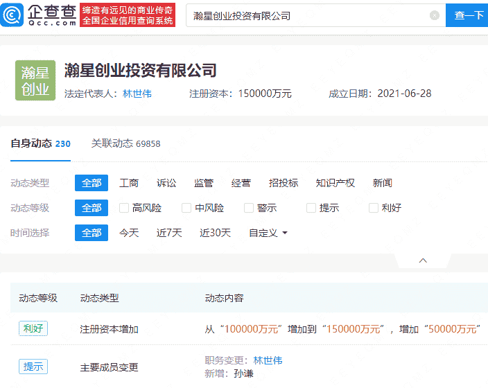 企查查APP显示,近日,瀚星创业投资有限公司发生工商变更,注册资本由10亿人民币增至15亿人民币,增幅50%,同时,公司主要人员亦发生变更。