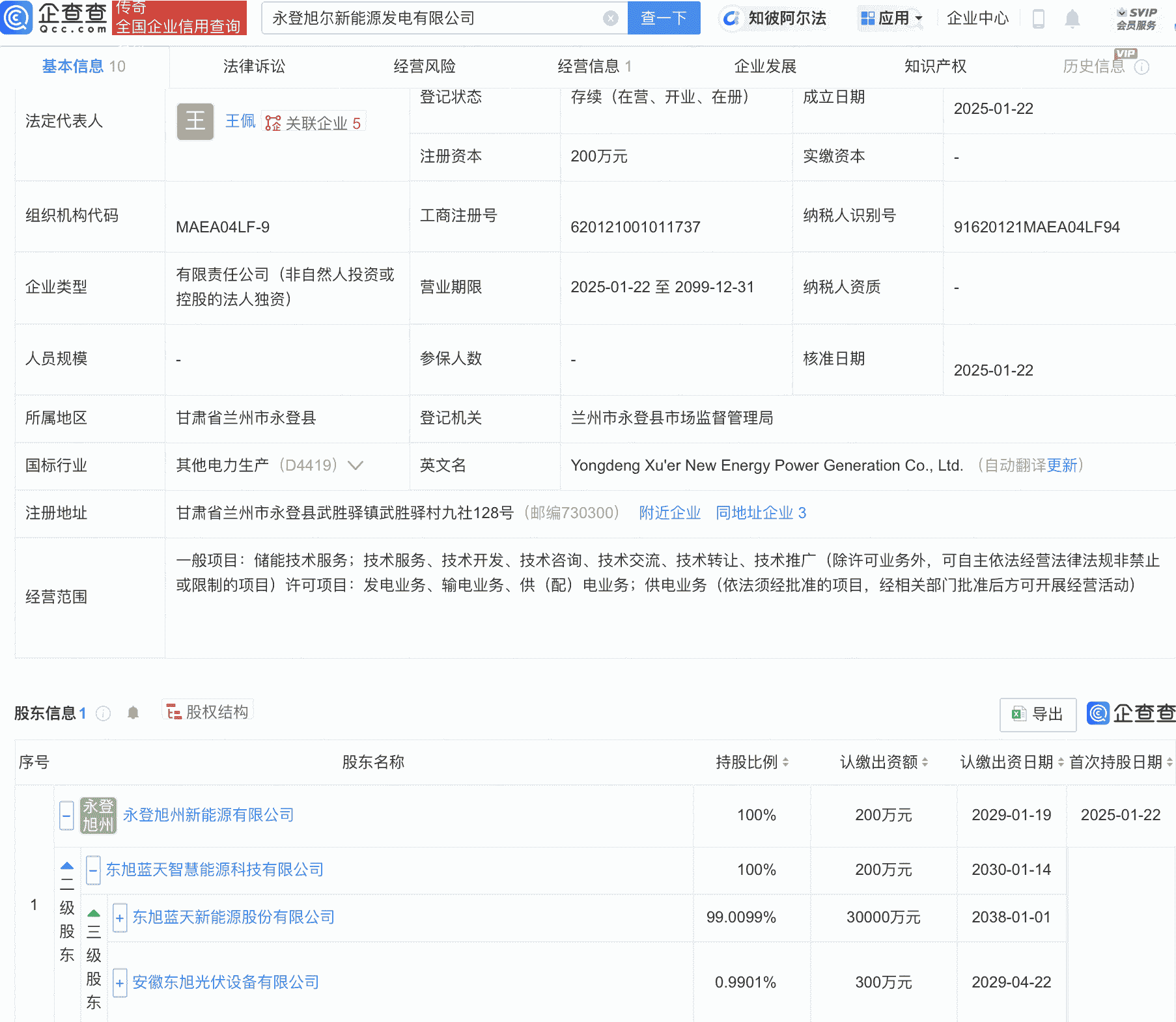 企查查APP显示,近日,永登旭尔新能源发电有限公司成立,法定代表人为王佩,注册资本200万元,经营范围包含:储能技术服务;发电业务、输电业务、供(配)电业务;供电业务等。企查查股权穿透显示,该公司由ST旭蓝(000040)旗下永登旭州新能源有限公司全资持股。