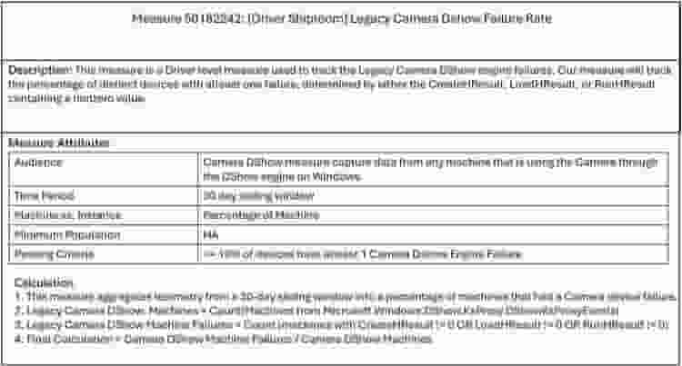 最后一个关键评估组件是“摄像头:用户模式崩溃:独立设备命中数/总体数量”。这一组件通过统计摄像头在用户模式下崩溃的独立设备数量与总体数量的比值,来评估摄像头的稳定性和可靠性。这一指标的引入,将有助于微软更准确地识别并解决摄像头相关的问题。