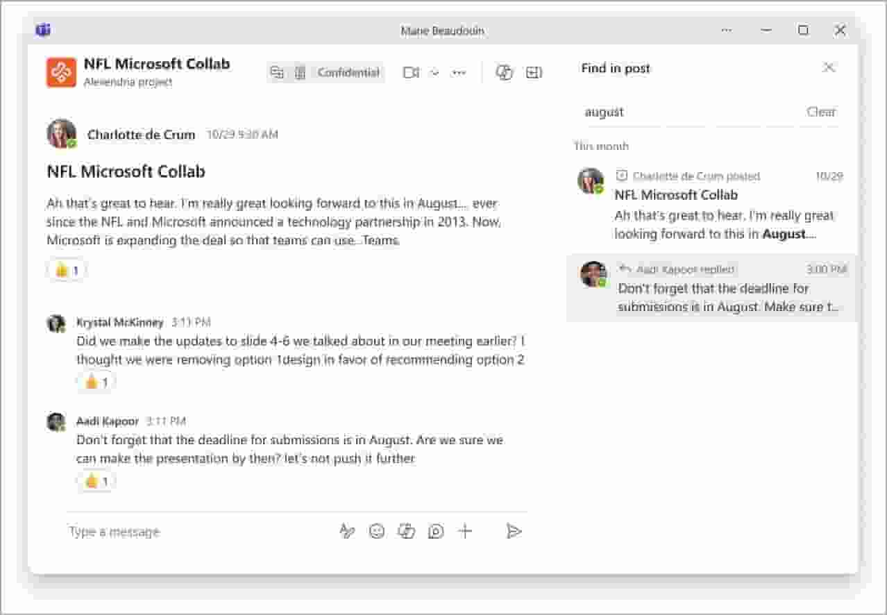 更新后的Microsoft Teams界面将发生显著变化,搜索栏被巧妙地整合到了右侧边栏中。当用户输入关键词进行搜索时,系统会将相关帖子原文与搜索结果并排呈现,使得信息对比更加直观。搜索结果中的标题和关键词将被高亮显示,帮助用户迅速锁定目标信息,进一步提升工作效率。
