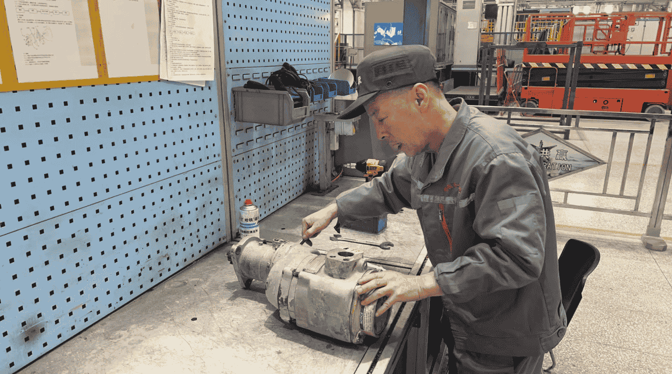 朱耀辉的眼神锐利而专注,他小心翼翼地用软布擦拭着拆解下来的每一个部件,随后逐一更换了驱动齿轮、齿轮弹簧护套和O形圈等关键零件。他蹲下身子,从不同角度仔细检查着箱型排气盖、马达箱和中间齿轮箱等部件,任何微小的变形或缺口都逃不过他的眼睛。他解释道:“启动马达通过前方伸缩齿轮的探出来带动柴油机的运转,这一部件至关重要。”同时,他还耐心地向周围的新入职大学生讲解着检修步骤,手上的工作丝毫未受影响。