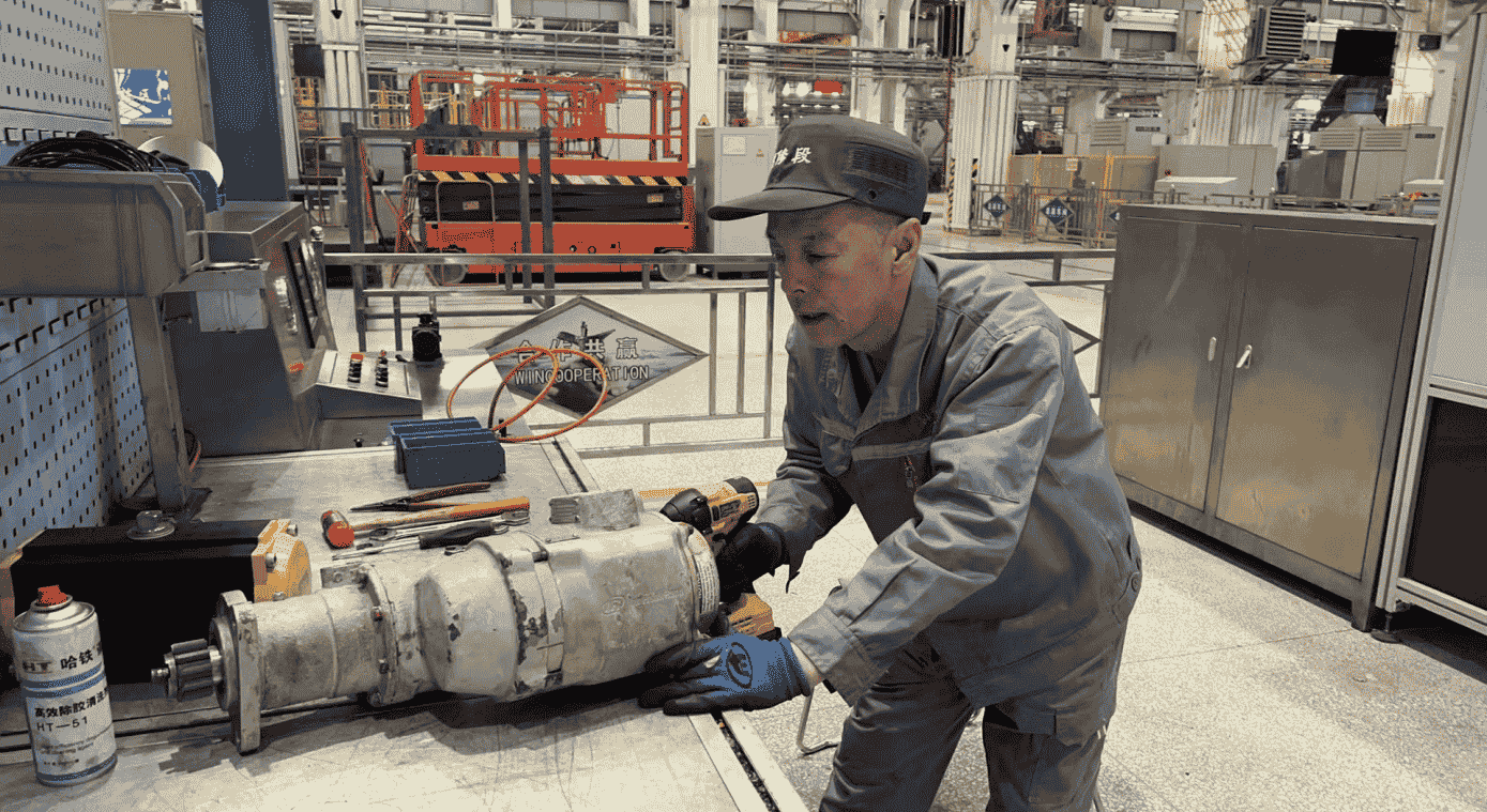 在中国铁路哈尔滨局集团有限公司哈尔滨大功率机车检修段内,一位名叫朱耀辉的高级技师正专心致志地对HXN3B型机车的启动马达部件进行精细检修。时间定格在1月21日,地点则是检修段组合库五跨的制动件检修区。