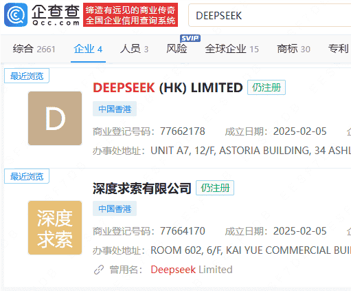 企查查APP显示,近日,Deepseek Limited更改名称为深度求索有限公司(Deepseek Limited)。据悉,该公司于2月5日在香港登记成立,属私人股份有限公司。同日另有一家名为“DEEPSEEK (HK) LIMITED”的公司在香港登记成立。
