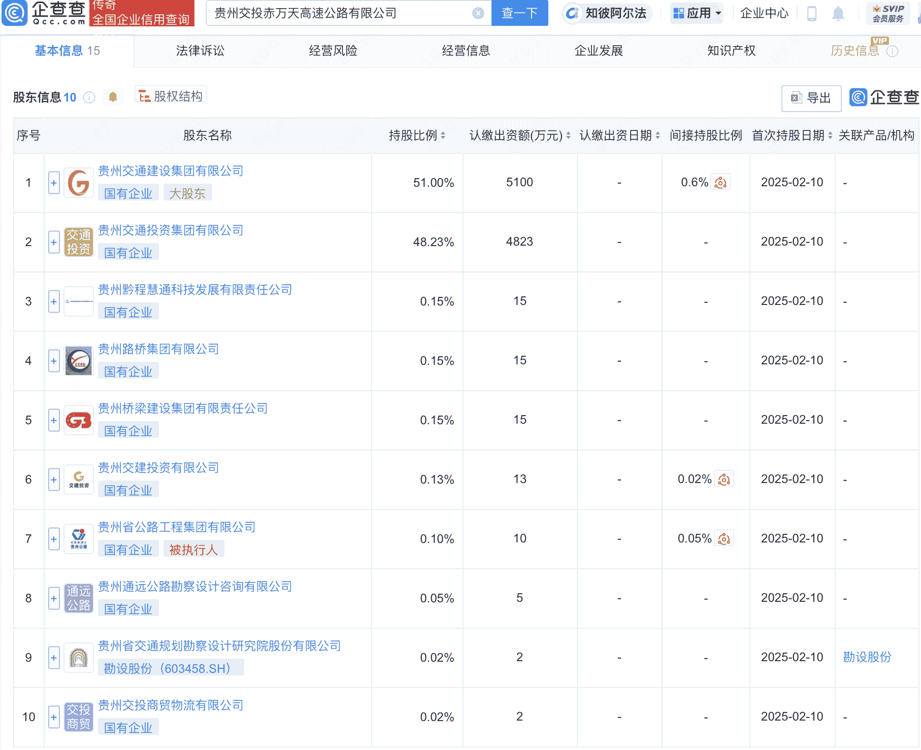 进一步通过企查查的股权穿透功能查询发现,贵州交投赤万天高速公路有限公司的股权结构颇为复杂,其中包含了勘设股份(股票代码:603458)等多家企业的共同持股。这一信息揭示了公司在资本层面的强大背景和深厚实力。