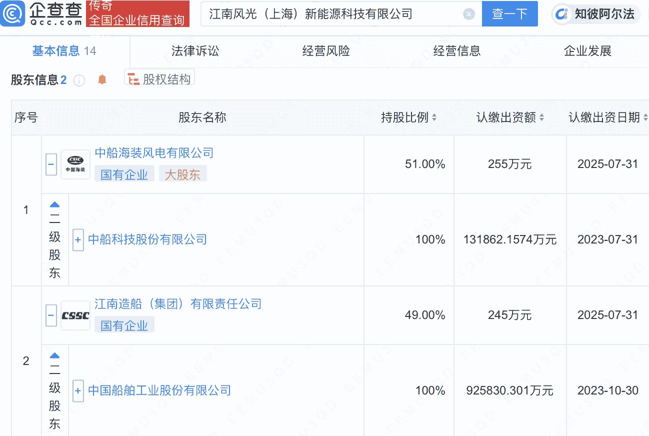 通过深入的股权穿透分析,我们发现这家新兴企业背后隐藏着两大实力股东的身影——中船科技(股票代码:600072)与中国船舶(股票代码:600150),它们通过间接持股的方式共同支持着江南风光(上海)新能源科技有限公司的发展。