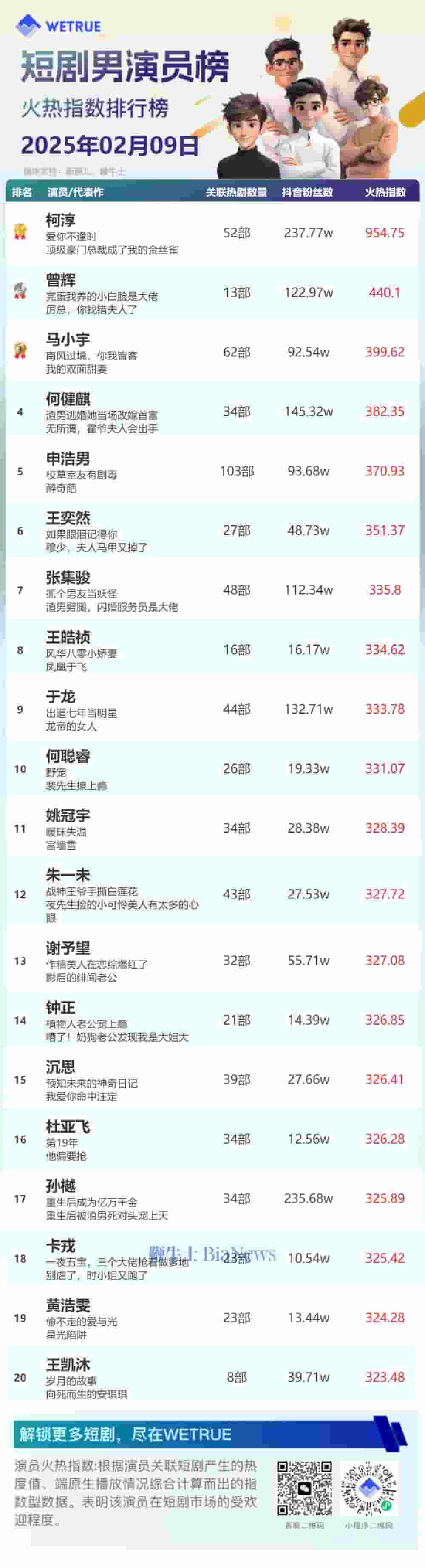 2月9日短剧演员火热榜出炉!余茵、柯淳登顶男女演员榜首