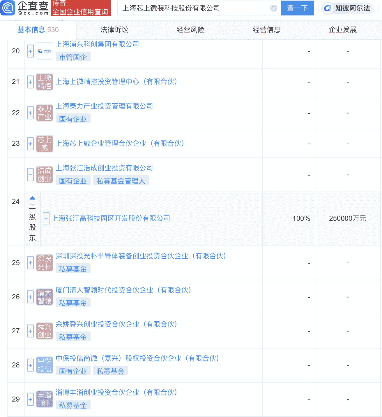 企查查APP显示,近日,上海芯上微装科技股份有限公司成立,法定代表人为何飞,注册资本5843.84万元,经营范围包含:半导体器件专用设备制造;半导体器件专用设备销售;电子专用设备制造等。企查查股权穿透显示,该企业由张江高科(600895)全资子公司上海张江浩成创业投资有限公司等共同持股。