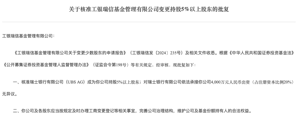 据中国证监会2月8日晚发布的公告显示,已批准瑞银成为工银瑞信基金持股超过5%的重要股东,并对瑞银依法受让工银瑞信基金4000万元人民币出资(占注册资本的20%)表示无异议。