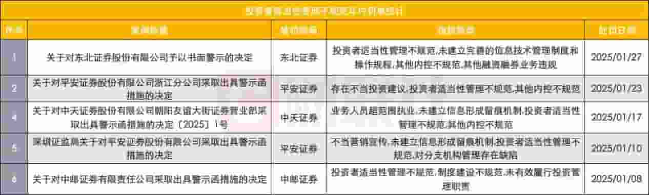 值得注意的是,投资者适当性管理问题已成为证券行业监管的重点领域。据统计,自2025年年初以来,因适当性管理不规范被罚的案例已多达5起,涉及东北证券、中天证券、中邮证券、平安证券等多家知名机构。其中,平安证券更是因同类问题年内两度被罚,显示出其在投资者适当性管理流程上存在系统性漏洞。