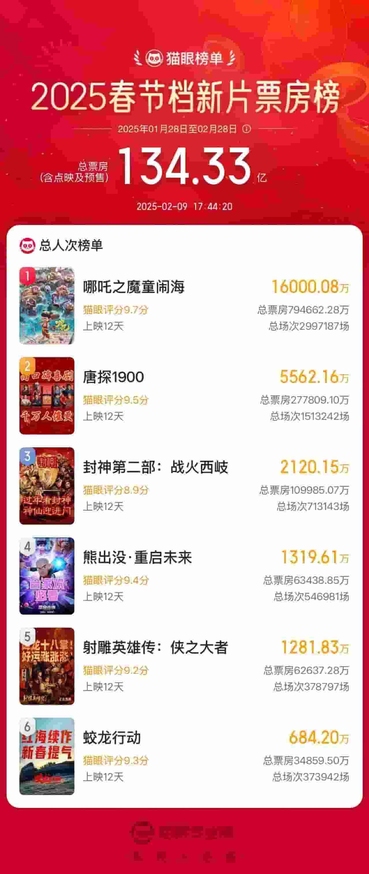 《哪吒之魔童闹海》观影人次破1.6亿,登顶中国影史冠军宝座!