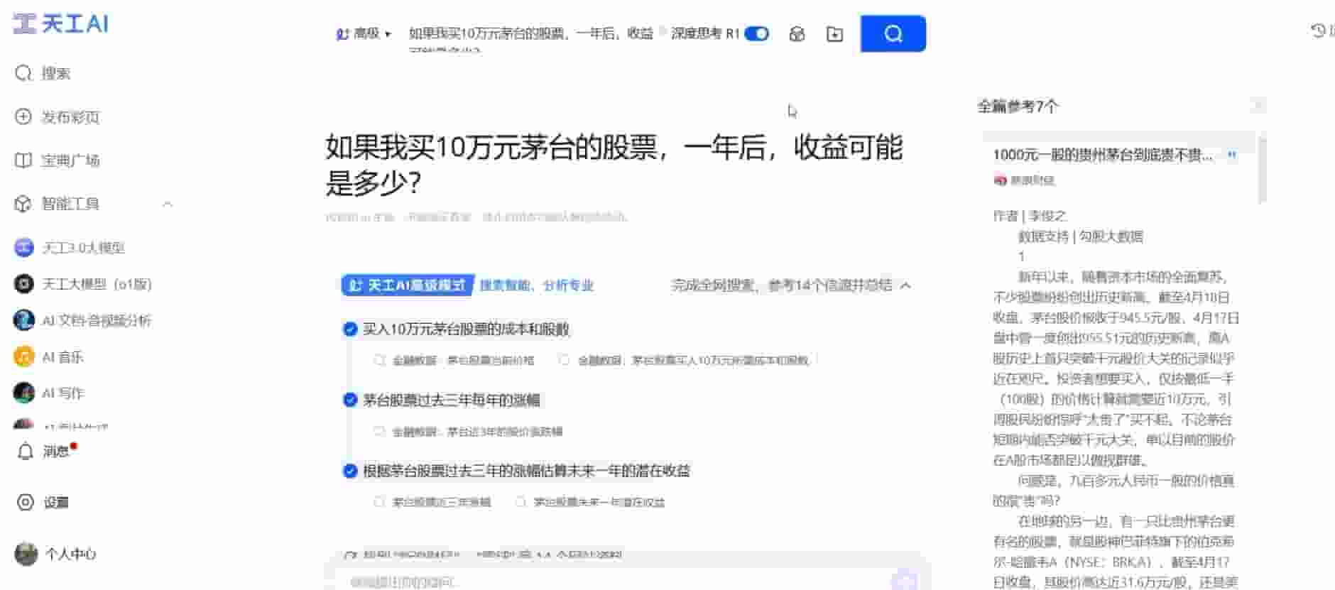 “天工AI”的“高级模式”也为用户提供了强大的支持。用户可以同时打开“高级模式”和“深度思考 R1”两个开关,轻松调用两亿篇英文论文、高质量财报研报等高质量数据库。在财经金融领域,用户可以通过“天工AI”搜索全网高质量的财经新闻、分析报告和财报,利用DeepSeek R1模型进行推理分析。例如,当询问购买10万元茅台股票一年后的收益时,“天工AI”搜索了14条参考资料并给出了详细的预测。