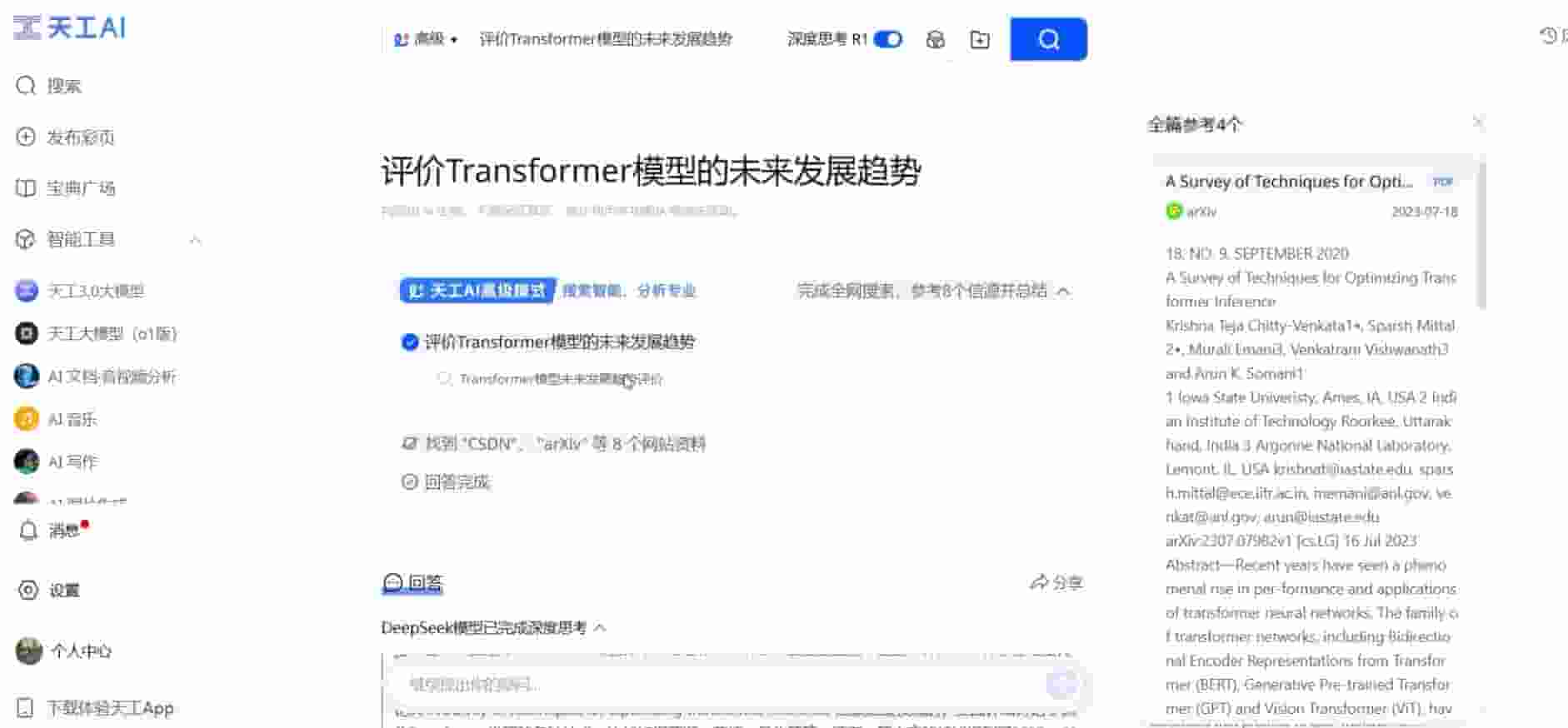 在学术领域,“天工AI”同样表现出色。在DeepSeek R1模型的加持下,2亿篇arXiv英文论文加上分钟级的更新速度,让学术领域的AI搜索更加高效便捷。例如,当询问Transformer模型的未来发展趋势时,“天工AI”给出了详细且深入的回答。