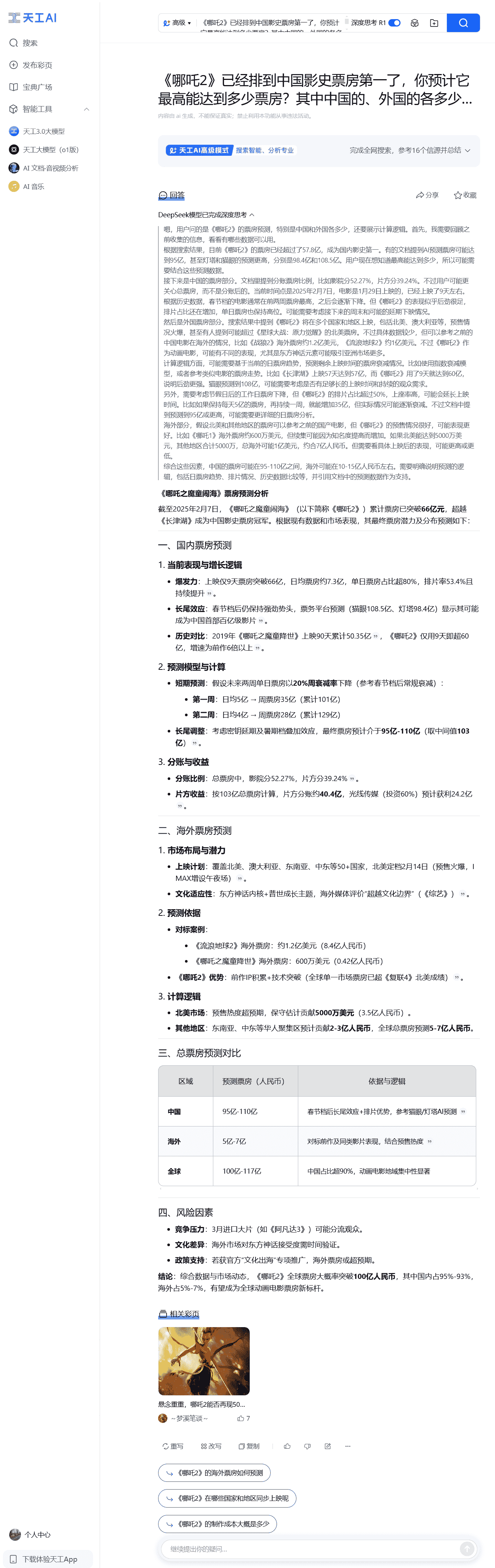 为了展示实际效果,我们来看一下“天工AI”接入DeepSeek R1模型后的表现。在搜索领域,“天工AI”的“深度思考 R1”模式能够轻松集成联网搜索功能。例如,当询问《哪吒2》的最终票房预测时,“天工AI”不仅捕捉到了最新的票房数据,还有理有据地预测了该剧的全球总票房将突破100亿人民币,其中国内票房占比高达93%-95%。
