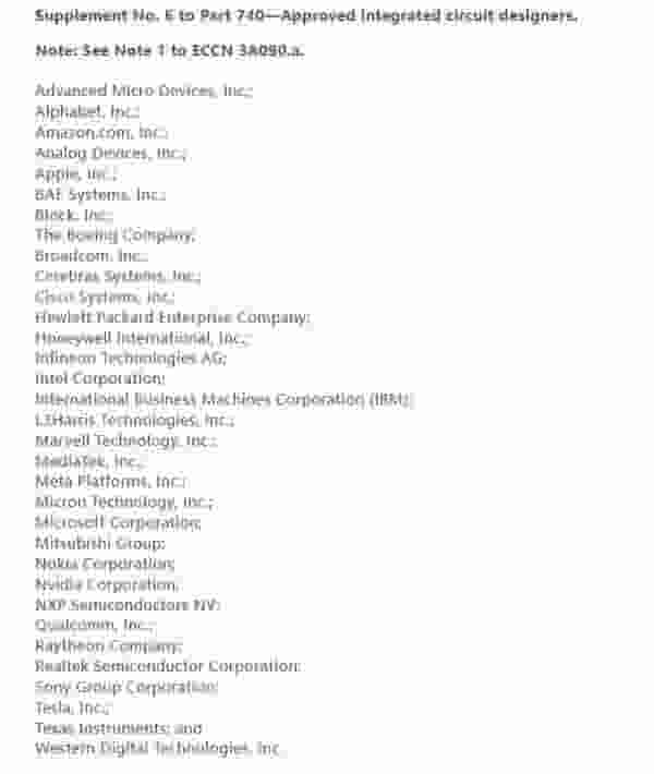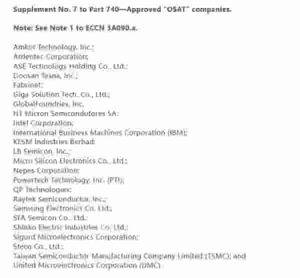 查阅BIS公布的相关清单,可以看到获得批准的IC设计企业共计33家,且均为知名的西方半导体企业。而在“approved OSAT”名单中,获批的半导体封装测试企业共有24家,包括日月光、格芯、Intel、IBM、力成科技、三星、台积电、联电等业界耳熟能详的名字。