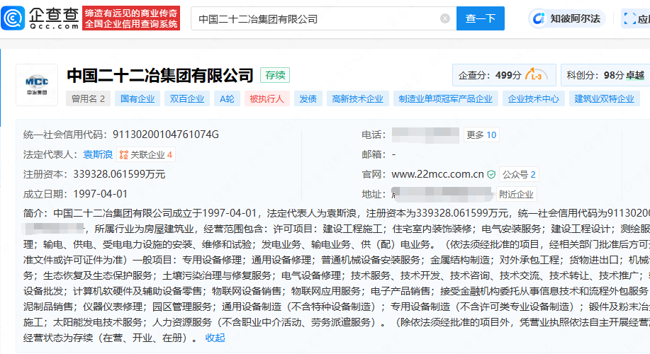 企查查显示,中国二十二冶集团有限公司成立于1997年4月,法定代表人为袁斯浪,经营范围包括建设工程施工、住宅室内装饰装修、电气安装服务、建设工程设计、测绘服务等,由中国中冶(601618)及上述新增股东共同持股。