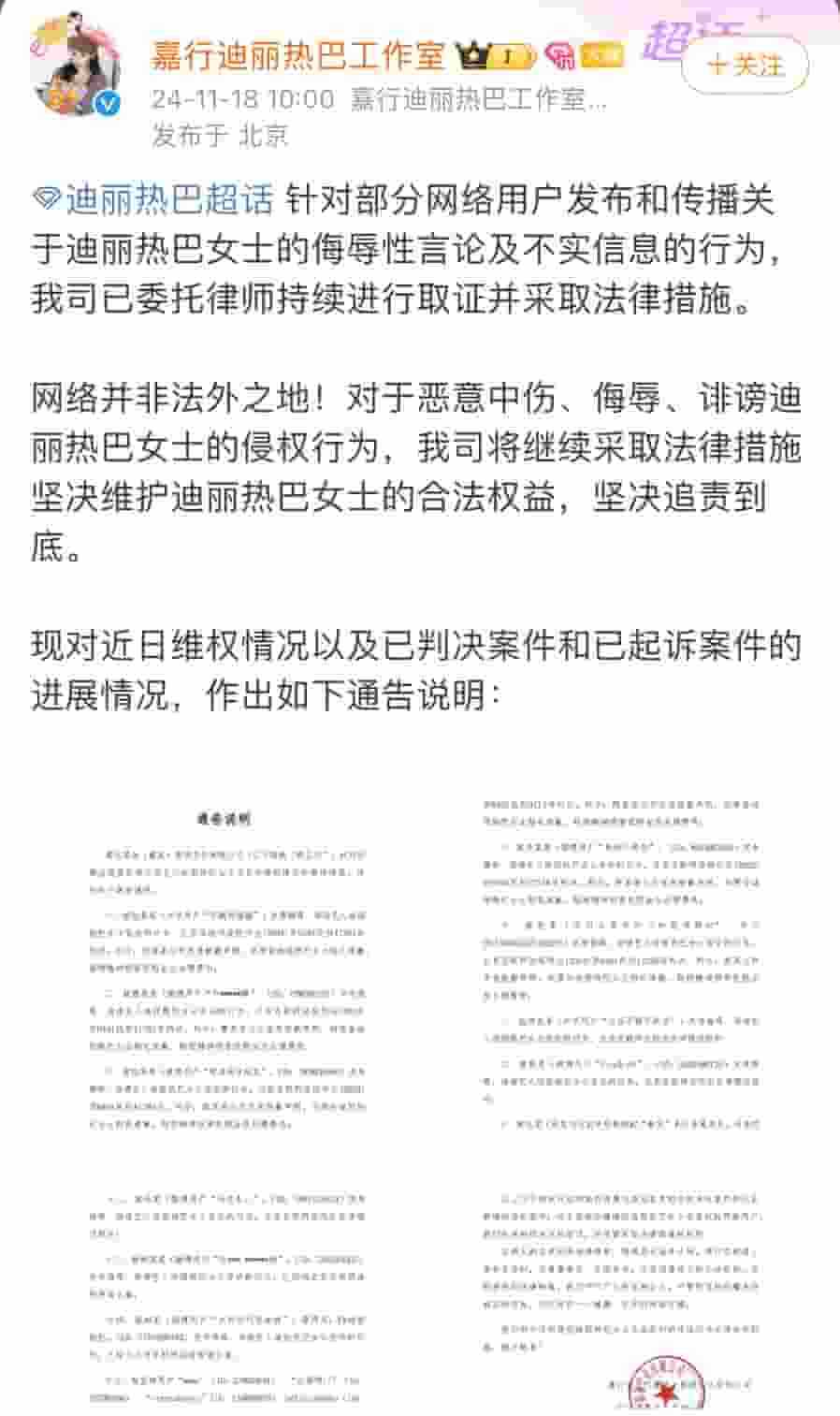 此前,迪丽热巴方发布告黑声明,对于恶意中伤、侮辱、诽谤迪丽热巴女士的侵权行为,平台将披露侵权主体的身份信息,并陆续对侵权个人提起诉讼。