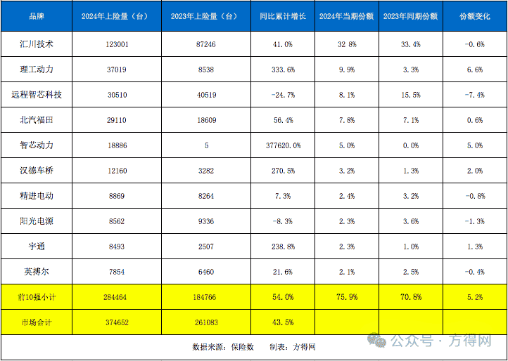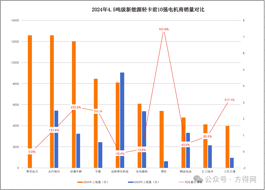 汉德车桥和宇通作为行业前十强的成员,也在2024年实现了市占率的明显提升。汉德车桥的新能源轻卡电机配套量达到了1.2万台,市占率达到3.2%;宇通的配套量则为8493台,市占率为2.3%。这两家企业的市场表现同样令人瞩目。