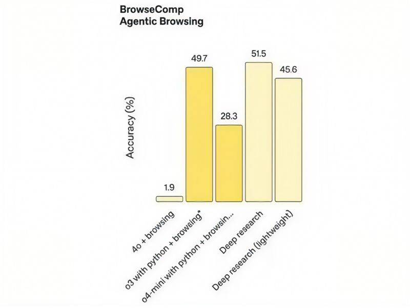 为了直观展示轻量版Deep Research的性能,OpenAI还公布了与其他模型的搜索准确率对比数据。数据显示,轻量版的准确率为45.6,略低于标准版的51.5和o3 with PythonBrowsing模型的49.7,但明显优于4oBrowsing模型的1.9和o4-mini with PythonBrowsing模型的28.3。