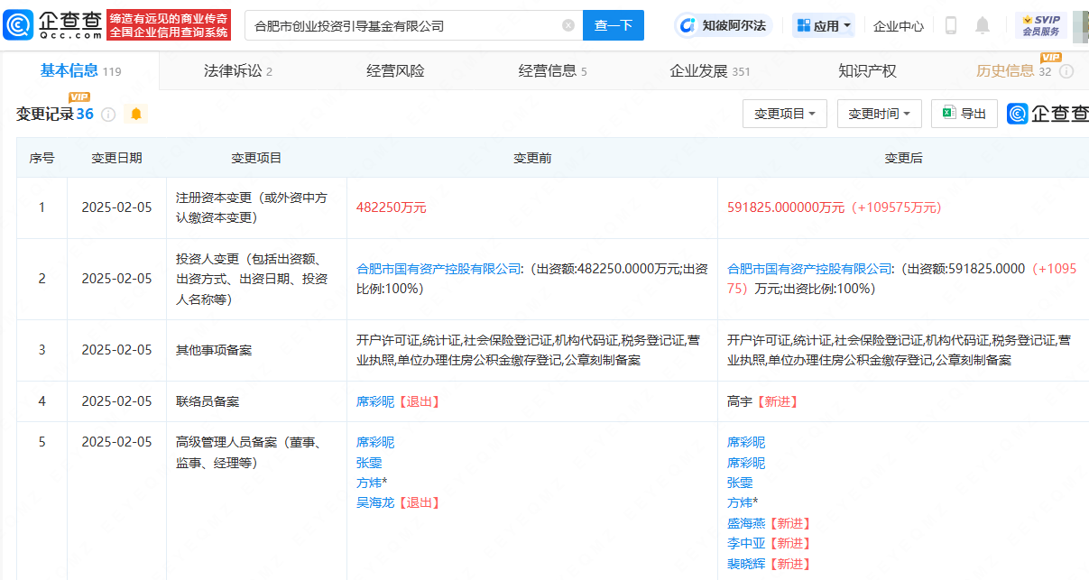 企查查还显示,合肥市创业投资引导基金有限公司由合肥市国有资产控股有限公司全资持股,这一背景为公司的稳健运营提供了有力保障。随着注册资本的增加和高层管理人员的调整,公司有望在新的发展阶段中,实现更加高效的运营和更广阔的发展空间。