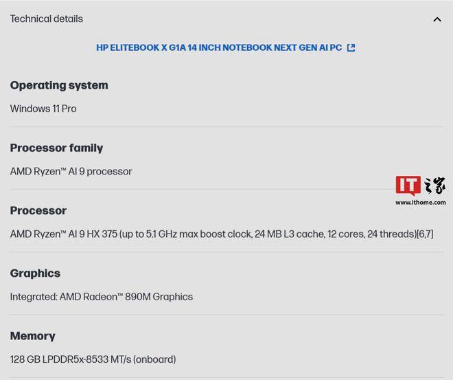 此前,AMD官网上所有“Strix Point”处理器的内存速度规格均标注为LPDDR5x-8000,且“Strix Point”平台与LPDDR5x内存的组合方案最大内存容量仅限于64GB。然而,惠普EliteBook X G1a的这一升级打破了这一限制,为用户提供了更强大的内存配置选择。