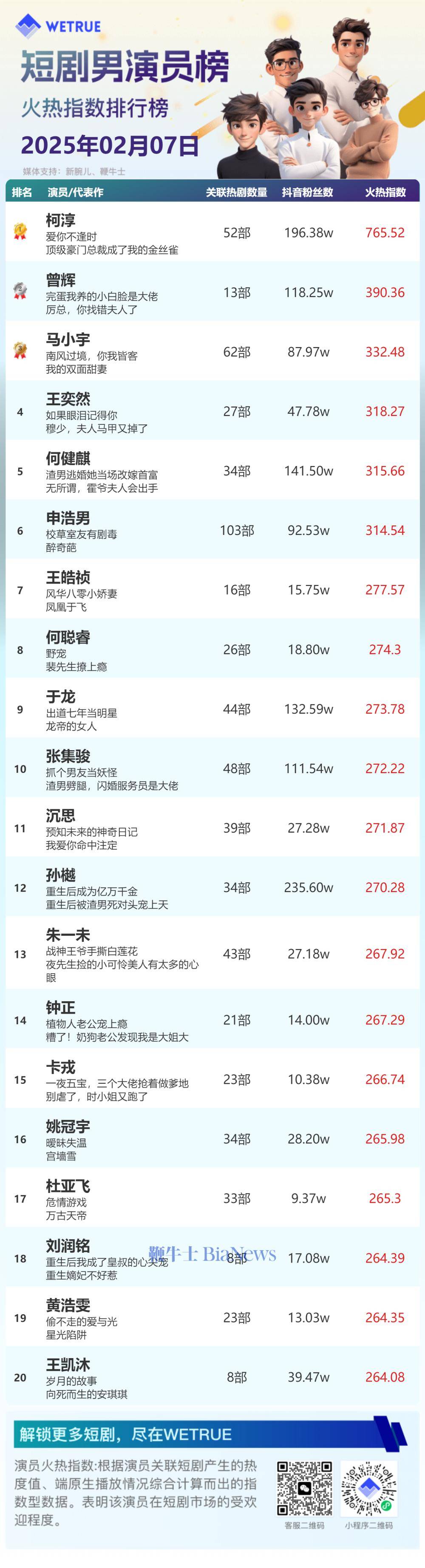 经过精心统计与分析,2月7日的短剧演员火热指数榜单现已揭晓: