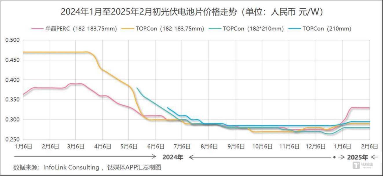 硅片环节则率先迎来了价格上涨。在持续减产和控价后,硅片供需情况明显改善,推动了2025年初的大涨行情。InfoLink数据显示,各品类N型硅片价格较12月底均大涨10%以上。市场普遍对硅片价格的走强持乐观态度,认为这加强了行业对自律控产、供需改善能有效刺激价格回升的信心。