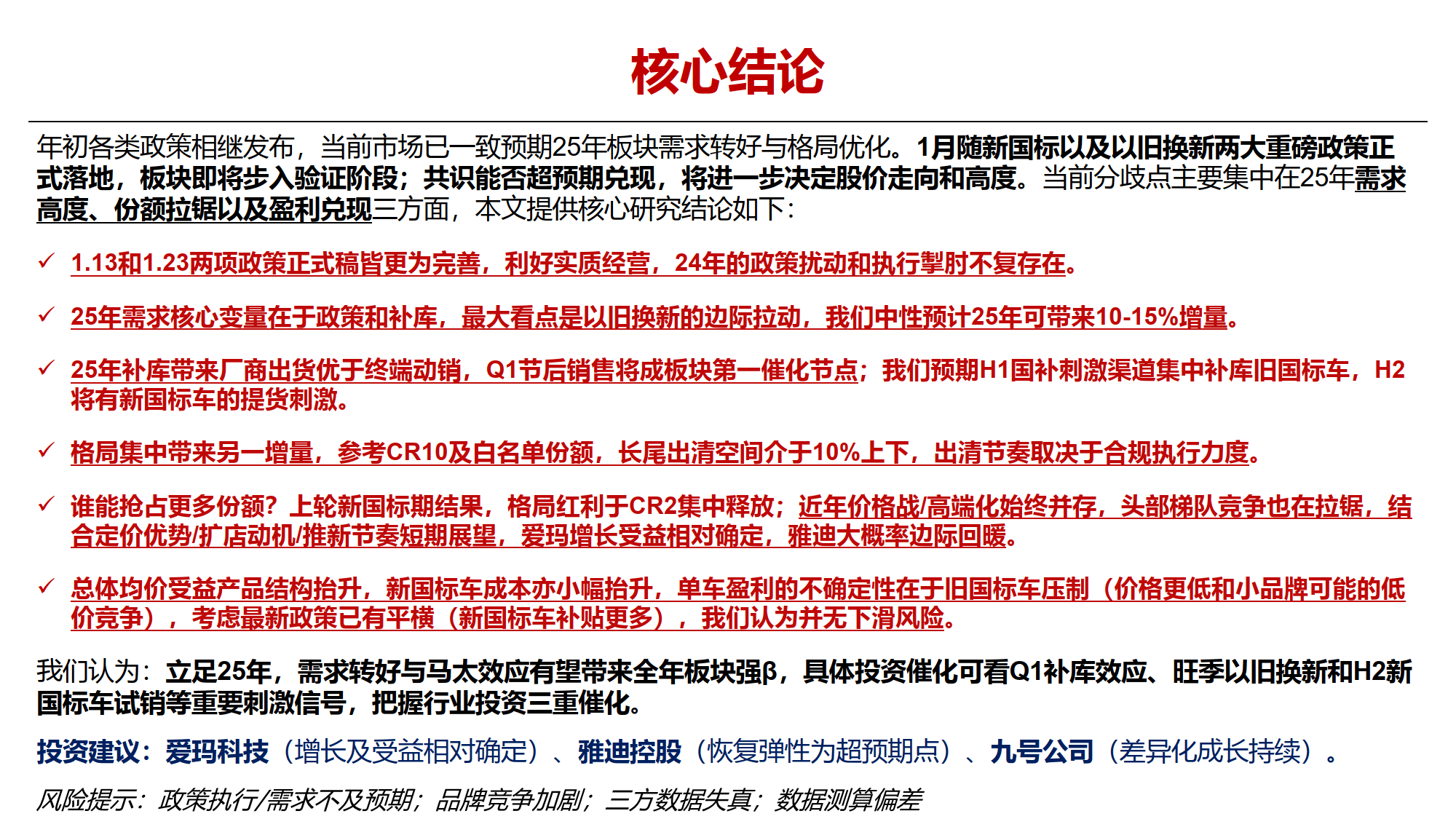 针对当前市场的分歧点,主要包括2025年的需求规模、市场份额的争夺以及盈利能力的兑现情况。核心研究结论显示,1月13日和1月23日发布的两项政策正式稿相比以往更为完善,有利于实质性经营,消除了2024年政策执行过程中可能存在的扰动和阻碍。