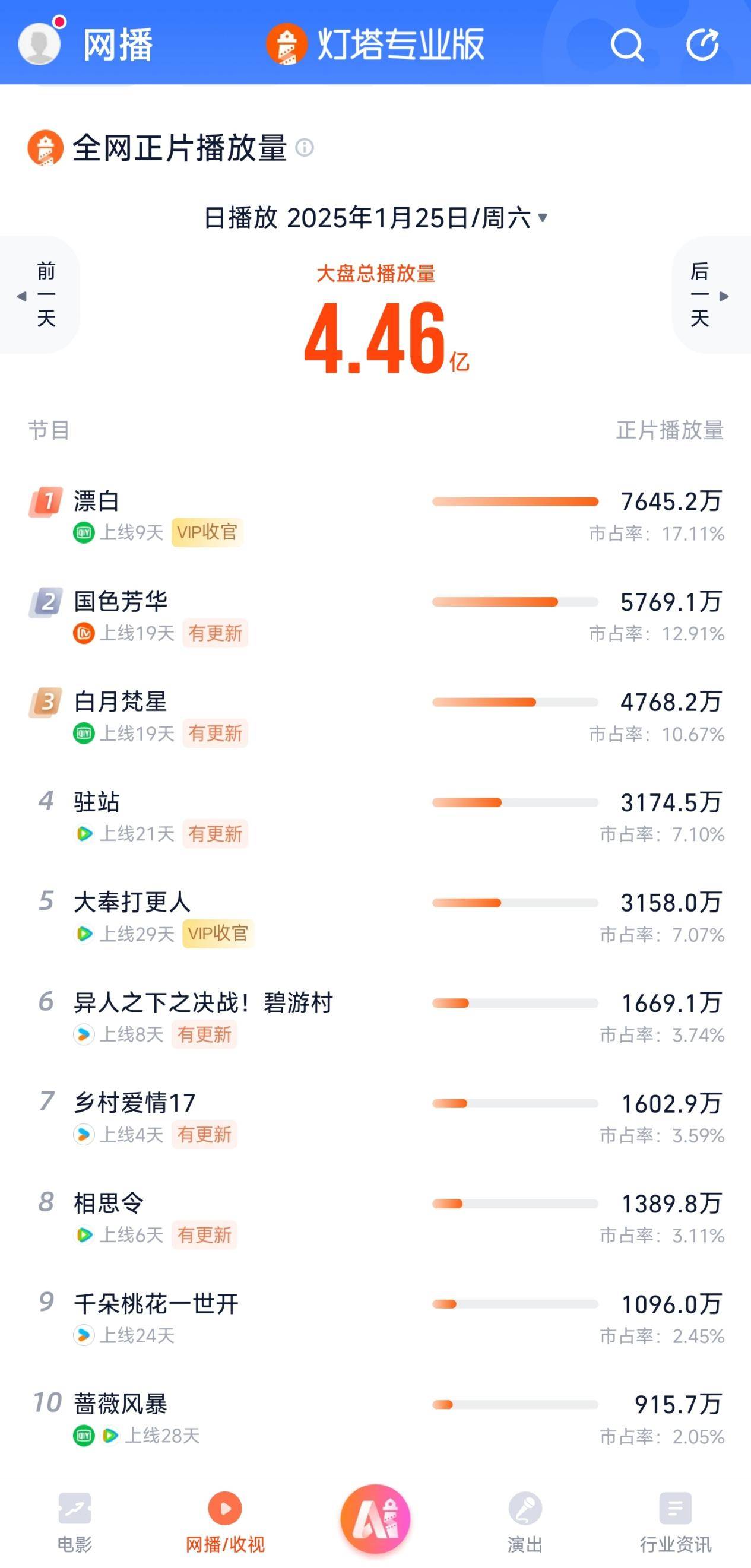 更令人惊讶的是,在VIP收官阶段,《大奉打更人》甚至无法与《国色芳华》和《白月梵星》等剧集相抗衡。根据灯塔专业版数据,《国色芳华》在1月12日以微弱的优势超越了《大奉打更人》,成为了当日市占率最高的剧集,而《大奉》的这一数据却是其开播以来的最高点。