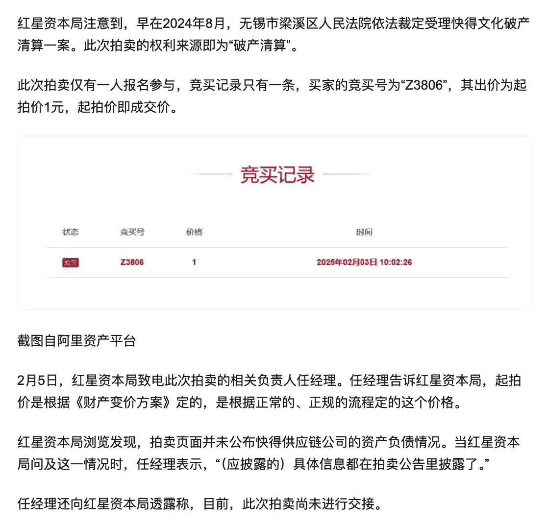 据悉,拍卖标的为盐城市快得供应链管理有限公司(快得供应链公司)80%的股权,拍品所有人为无锡快得文化传媒有限公司(快得文化)。企查查APP显示,快得文化成立于2023年3月,注册资本100万元,耿立生担任法定代表人并全资持股。司法案件显示,该公司涉及多条执行案件,并于2024年6月被江苏省无锡市梁溪区人民法院申请破产清算。快得供应链公司成立于2023年4月,注册资本为100万元,快得文化持股80%。