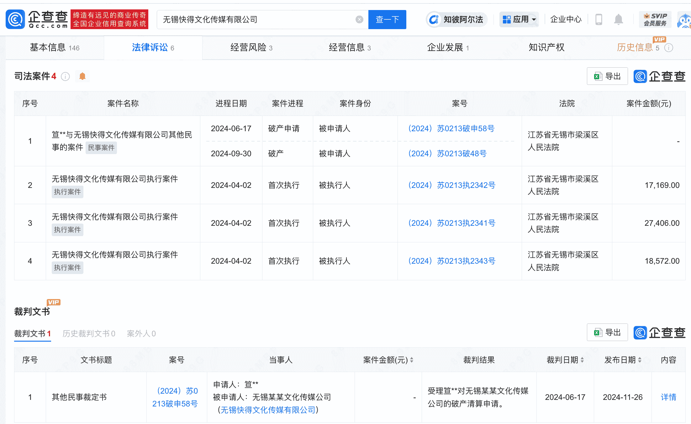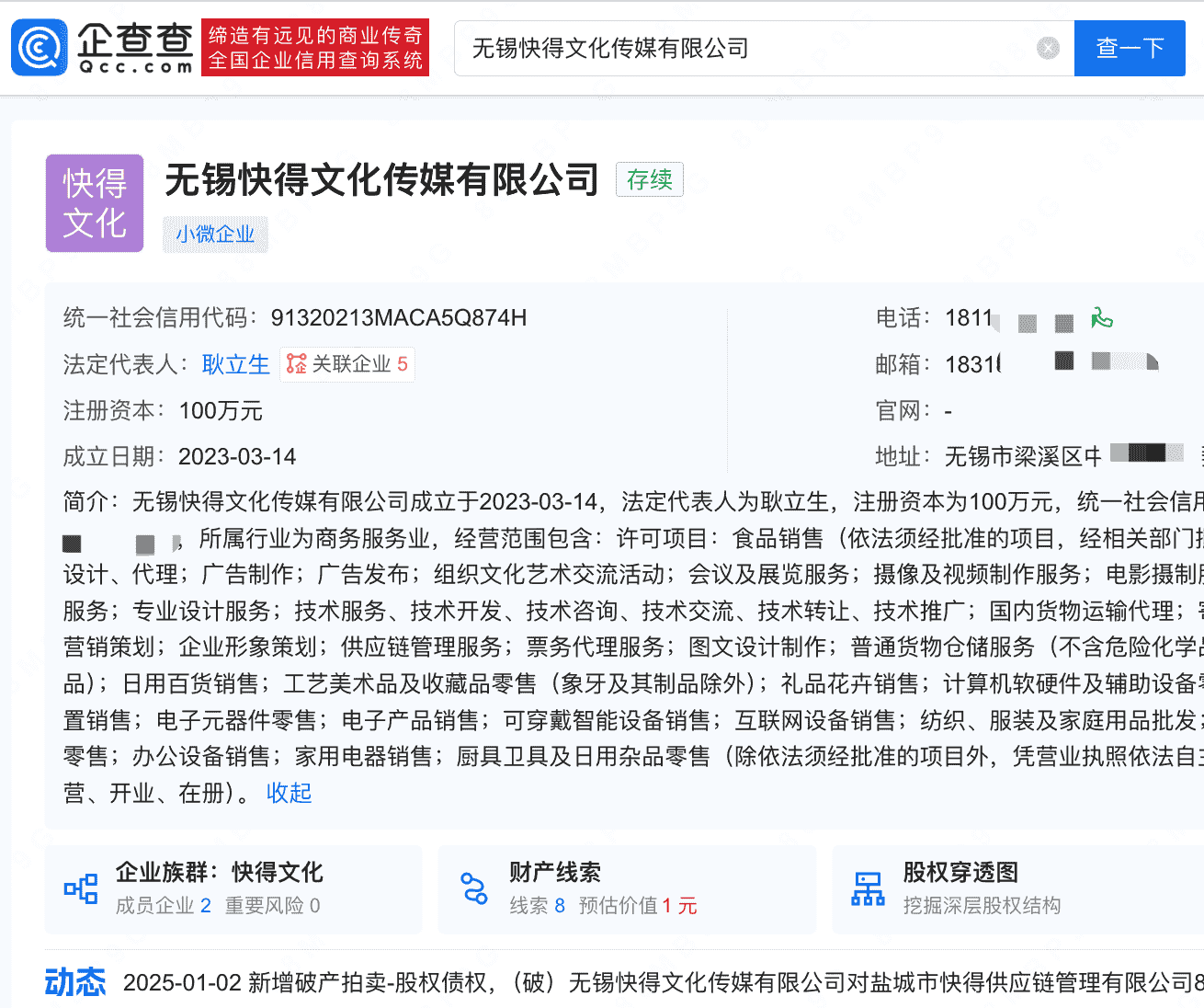 拍卖的标的为盐城市快得供应链管理有限公司(简称“快得供应链”)的80%股权,而这些股权的持有人为无锡快得文化传媒有限公司(简称“快得文化”)。据企查查APP显示,快得文化成立于2023年3月,注册资本为100万元人民币,由耿立生担任法定代表人并全资控股。然而,这家公司的命运似乎并不平坦,司法记录显示,它涉及多起执行案件,并在2024年6月被江苏省无锡市梁溪区人民法院裁定进入破产清算程序。