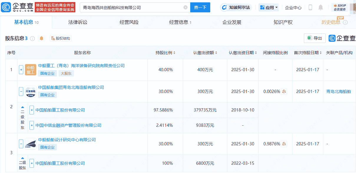 进一步股权穿透分析显示,青岛海西共创船舶科技有限公司的股东背景实力强大。它由中国船舶重工集团旗下的中船重工(青岛)海洋装备研究院有限责任公司,以及中国重工(股票代码:601989)所属的中国船舶集团青岛北海造船有限公司和中船船舶设计研究中心有限公司共同持股。这一组合无疑为公司的未来发展提供了坚实的后盾。