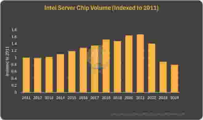 从相关图表中不难发现,英特尔的服务器处理器业务自2011年以来一直保持平稳增长态势。然而,这一趋势在2022年发生了急剧变化,销量开始大幅下滑。到了2024年,其销量已不足峰值时期的一半,这一变化无疑令人震惊。