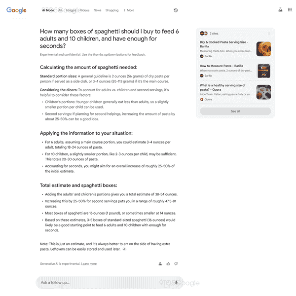 为了展示这一功能的强大,谷歌向员工提供了一系列示例问题,诸如“为6名成年人和10名孩子准备足够分量的意大利面,需要购买多少盒?”等,这些问题都旨在体现AI在理解复杂需求并提供精准答案方面的能力。