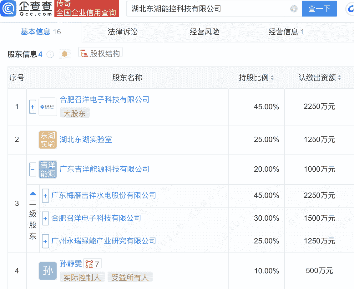 企查查APP显示,近日,湖北东湖能控科技有限公司成立,法定代表人为孙静雯,注册资本5000万元,经营范围包含:能量回收系统研发;储能技术服务;资源再生利用技术研发;合同能源管理等。企查查股权穿透显示,该公司由广东吉洋能源科技有限公司等共同持股,后者大股东为梅雁吉祥(600868)。