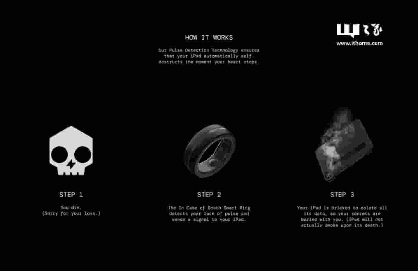 Zugu公司强调,该智能戒指具有防误触功能,能够识别是否被从手指上取下,从而避免在充电时误触发iPad的自毁功能。这款套装在设计上融入了黑色幽默元素,提供了多种“死亡保护”选项,用户可以根据个人喜好选择单独或组合使用。