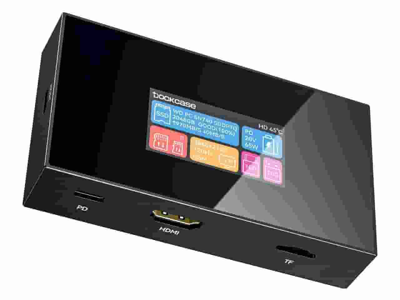 令人瞩目的是,Dockcase在扩展坞的顶部设计了一块1.9英寸的触控LCD屏幕,分辨率为320×170。这块屏幕能够实时显示各个接口的工作状态,以及内置SSD的健康信息。用户还可以通过屏幕上的操作,一键将SSD切换为只读模式,从而有效保护存储在其中的数据安全。