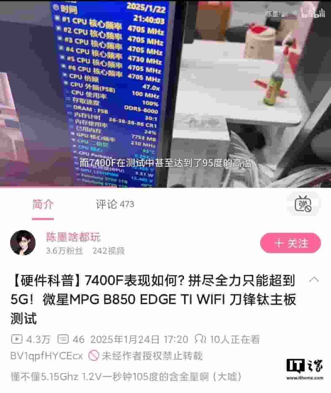 然而,使用硅脂作为导热介质也带来了一些问题。据B站用户“陈墨啥都玩”的测试显示,在搭载360mm一体式水冷散热器的情况下,锐龙5 7400F在运行CinebenchR23时的峰值温度竟高达95℃。他指出,为了确保有效散热,至少需要使用五热管的风冷散热器。
