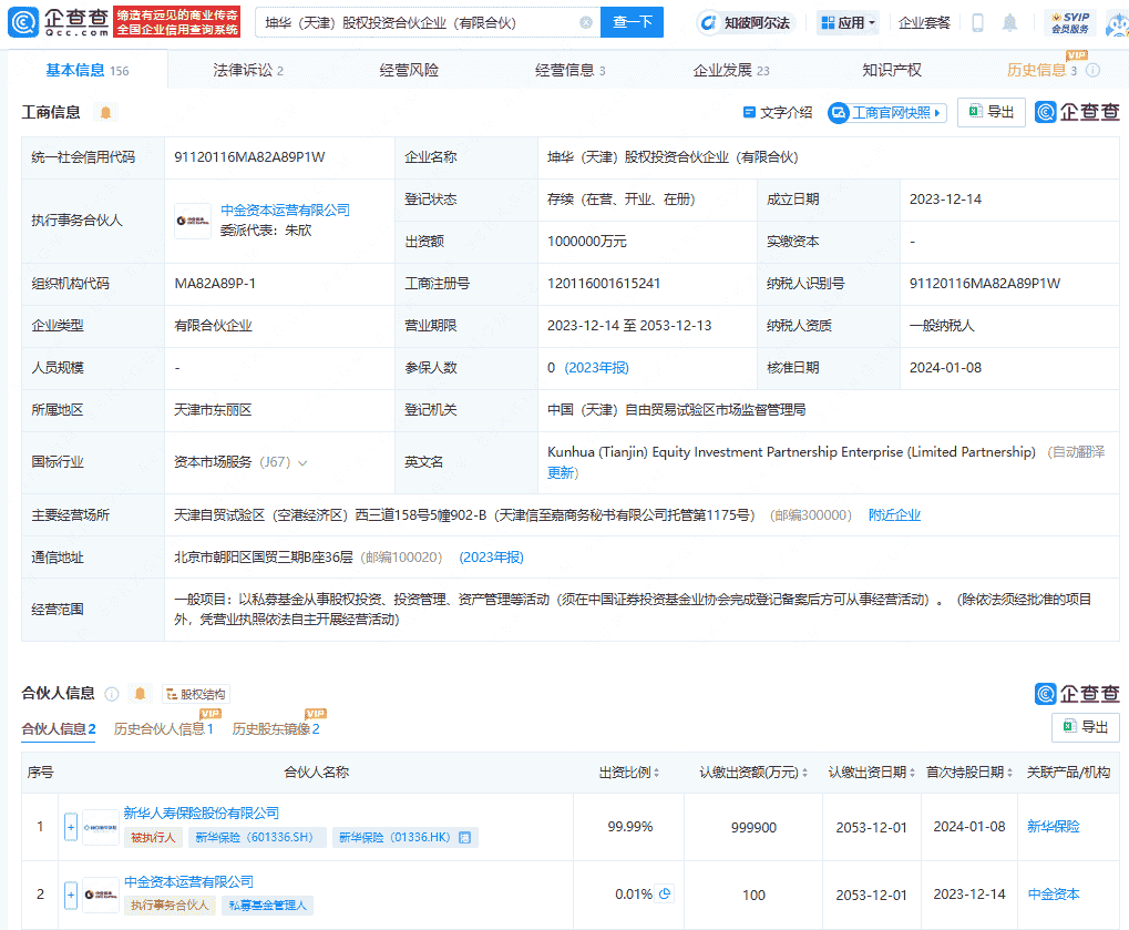 企查查股权穿透显示,坤华(天津)股权投资合伙企业(有限合伙)由新华保险(601336)、中金资本运营有限公司分别持股99.9%、0.1%。此前,坤华(天津)股权投资合伙企业(有限合伙)已接盘万达旗下多家公司。