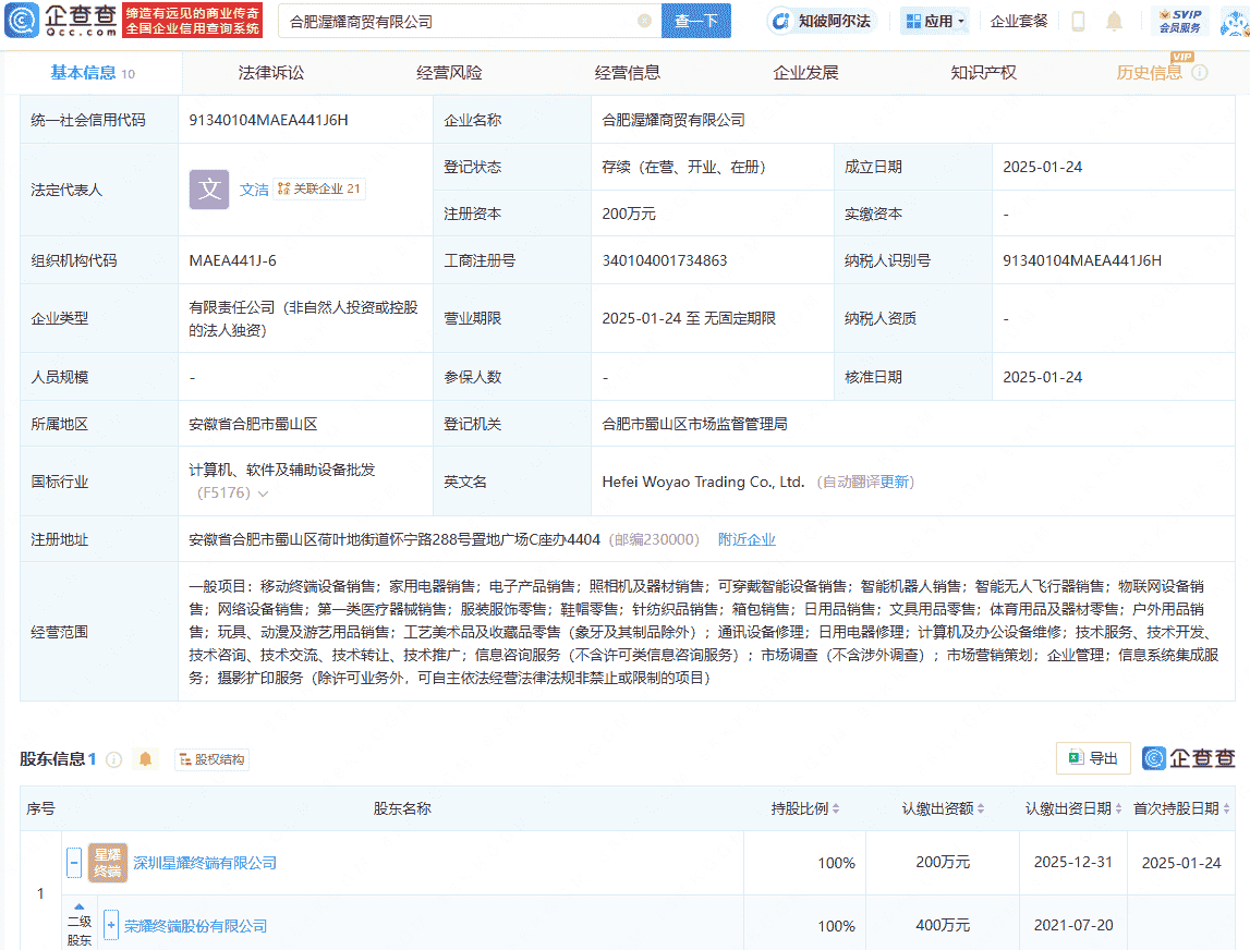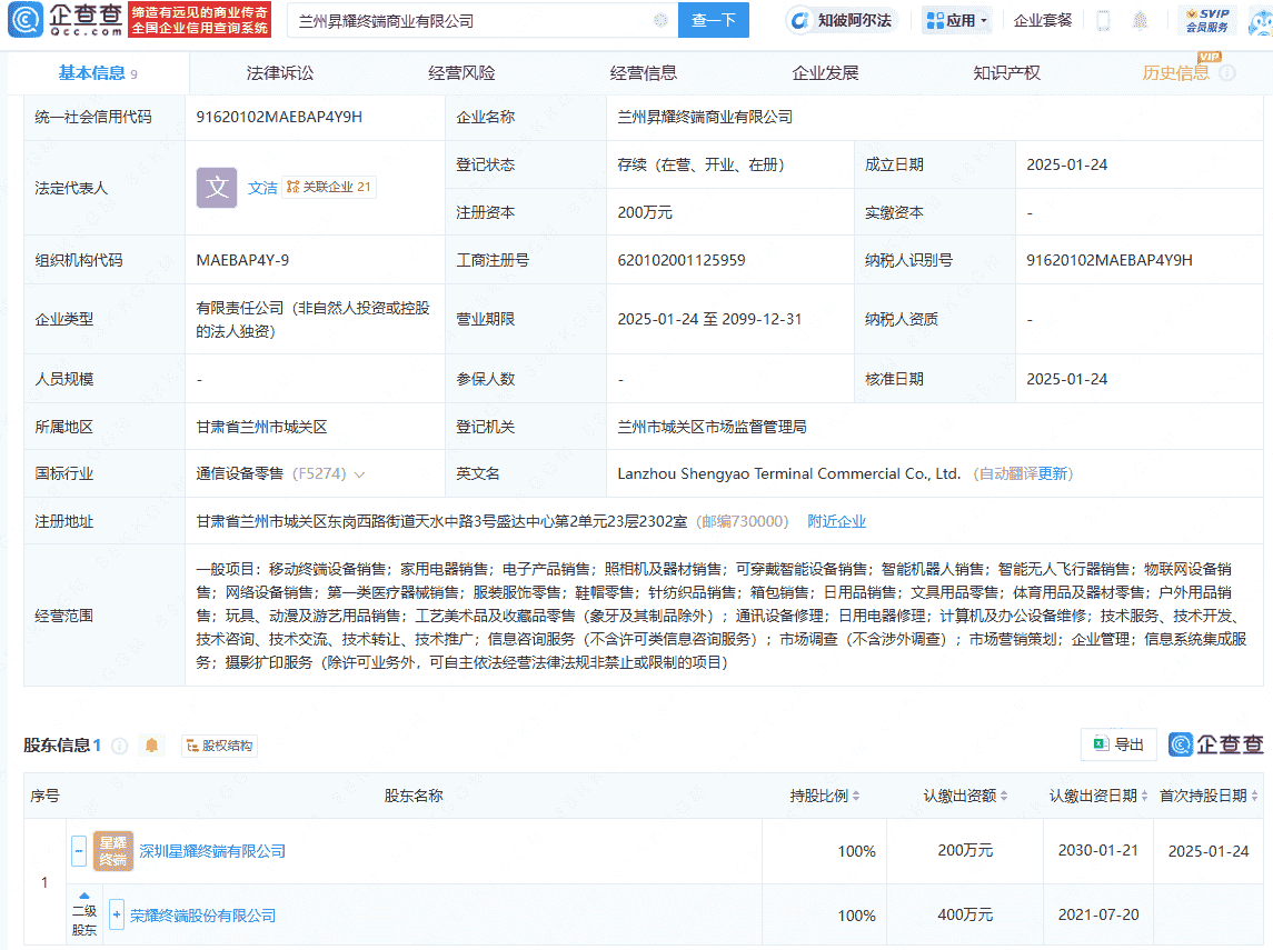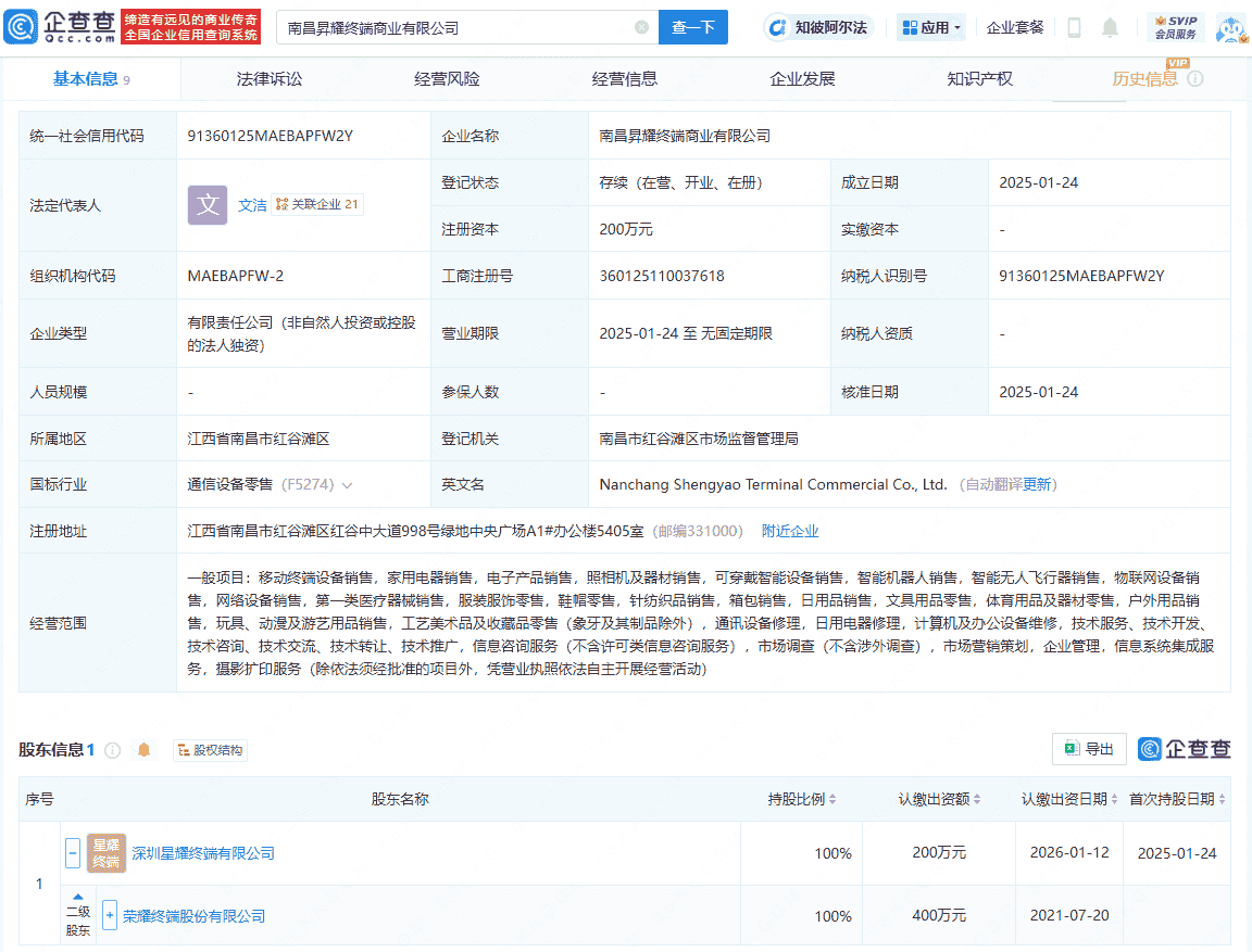 近期,企查查APP披露了一则关于荣耀终端股份有限公司新成立四家子公司的消息。这四家公司分别为南宁星耀终端商业有限公司、合肥渥耀商贸有限公司、兰州昇耀终端商业有限公司以及南昌昇耀终端商业有限公司,它们的法定代表人统一为文洁。